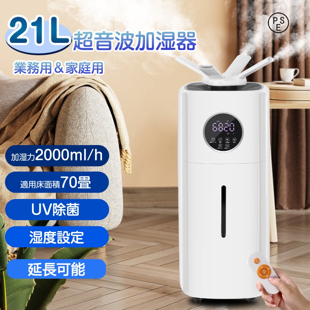 関連キーワード 21L業務用 湿度設定 加湿器 大容量 21L UV除菌 超音波加湿器 業務用 次亜塩素酸水対応 70畳 2000ml/hパワー 4つ吹出し口 2種類ノズル スチーム ミスト 上から給水 タイマー リモコン付 駅構内 寮 トイレ リビング キッチン 浴室PSE認証済